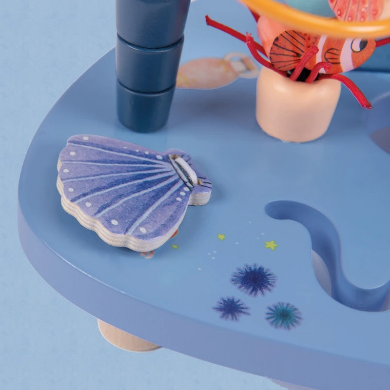 Le circuit de perles Les aventures de Paulie Moulin Roty est composé d’un socle en bois bleu, d’où émergent deux tiges métalliques pour y faire coulisser de jolies billes colorées et décorées, pour certaines en forme d’animaux et de coquillages. Glisser ces perles et les faire passer d’un étage à l’autre développe chez votre enfant la précision et la coordination de ses gestes.