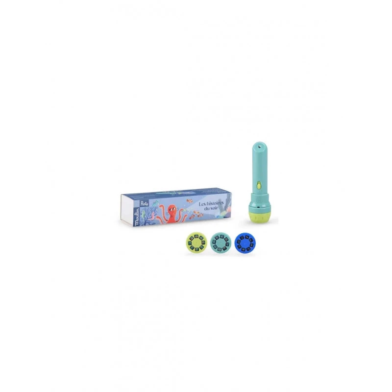 Si vous ne connaissez pas les fameuses lampes à histoire de Moulin Roty, découvrez-les sans tarder ! Il agit d’une petite torche d’environ 15 cm qui projette des images enfantines sur le mur ou le bois du lit. Ces illustrations servent de support aux histoires que vous imaginez pour endormir votre bout de chou.