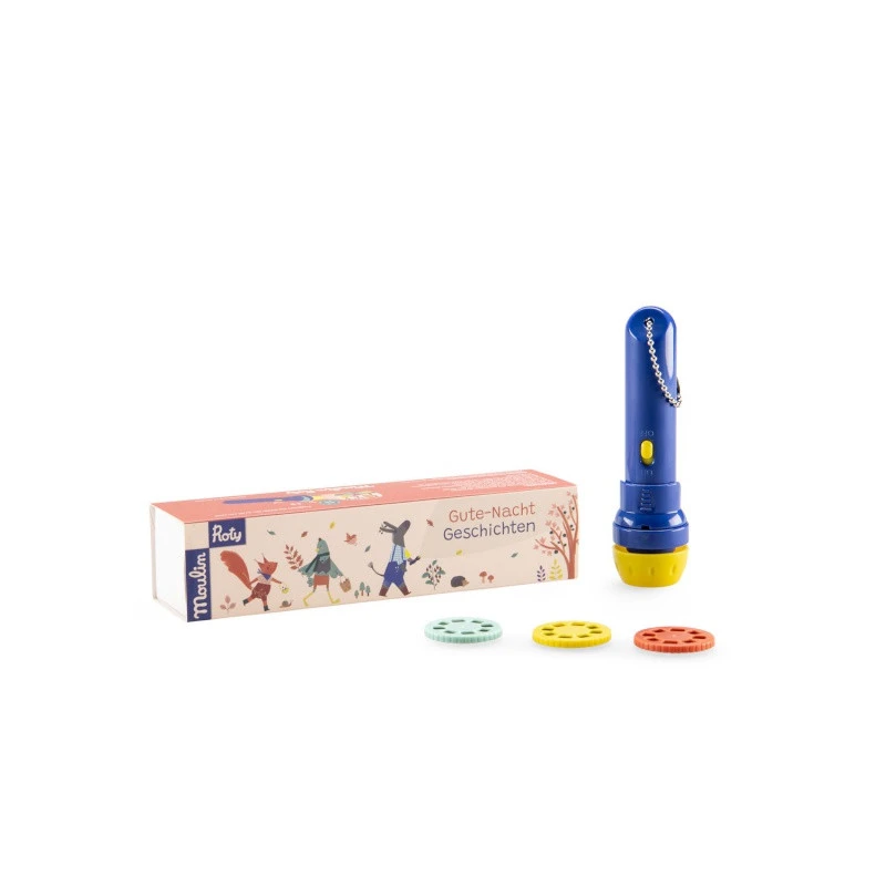 Moulin Roty vous présente la lampe à histoires Moulin Roty Pomme des bois ! Il s’agit d’une petite torche bleue et jaune d’environ 15 cm qui projette des images enfantines sur le mur ou le bois du lit de votre enfant. Ces illustrations sont directement inspirées de l’ambiance douce de la collection Pomme des bois et des petits personnages de la gamme. Retrouvez ainsi Anatole l’âne et Harry l’écureuil accompagnés de leurs amis, devenus les héros des histoires que vous allez inventer pour endormir votre tout petit.