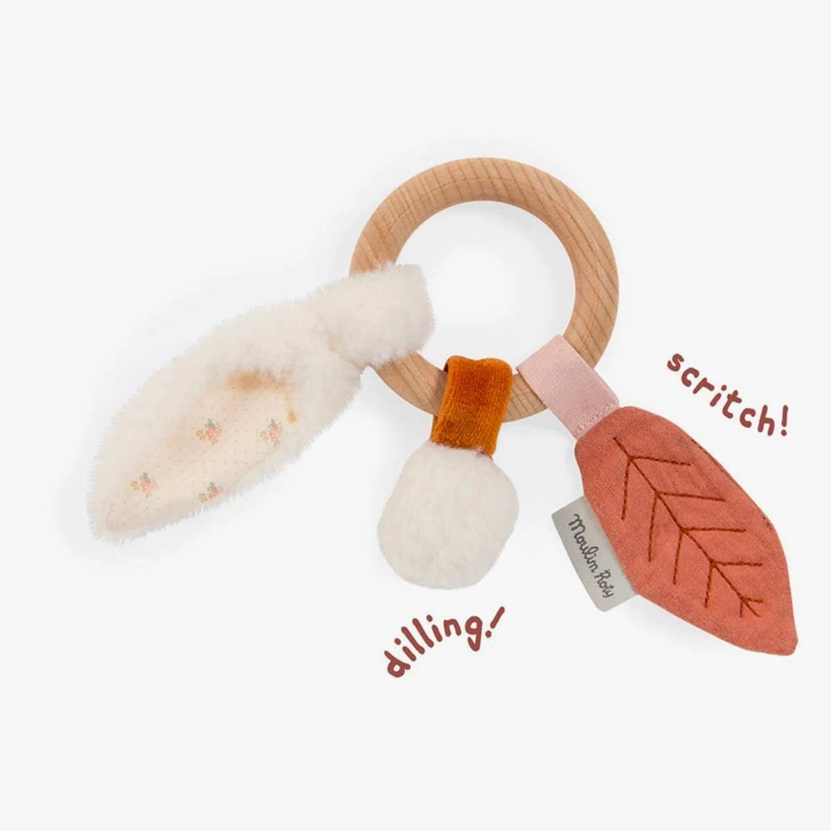 Anneau rond en bois naturel, sur lequel sont cousus une feuille, une oreille et une queue de lapin en fourrure avec quelques surprises… Du papier bruissant et des grelots pour éveiller bébé durant les balades d’automne !