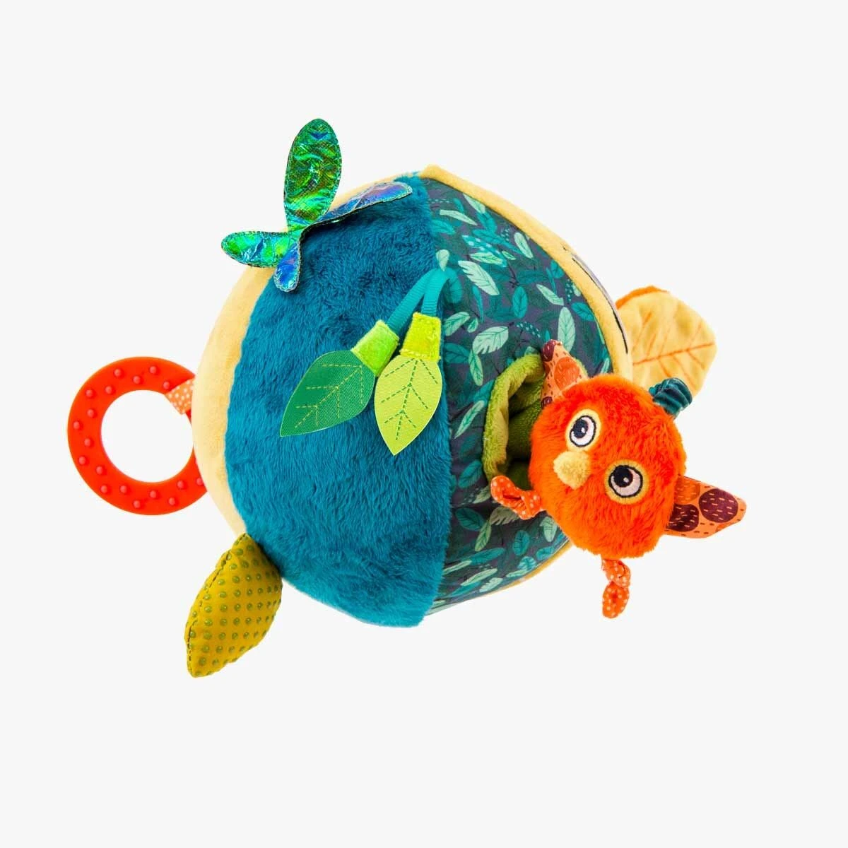 La balle d’activité regorge de gris-gris… Sur les 6 faces colorées on y trouve des feuilles, un papillon délicatement posé, un caméléon agrippé, un poussin suspendu, des rubans et nouettes, et un anneau dentaire pour soulager les poussées dentaires.