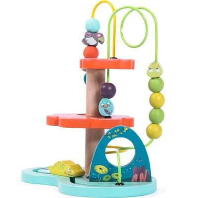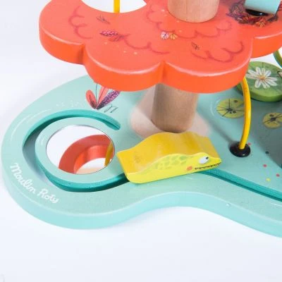 Le boulier Dans la Jungle de la marque Moulin Roty est un jeu d’adresse et de manipulation en bois coloré. Il comprend un socle représentant un marais, avec un crocodile qui bouge dans une rainure et un miroir. Deux axes en métal traversent une montagne et un arbre pour faire glisser les perles à travers la jungle.
