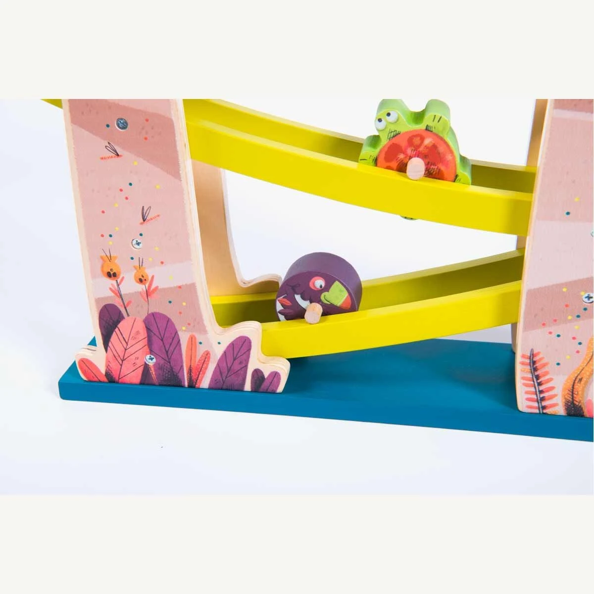 Les toupies dévalent les pentes de la jungle ! Cette cascade est composée de passerelles inclinées reliant deux baobabs en bois, où se laissent rouler les toupies toucan, serpent, et tortue. Leur terrain de jeu préféré !
