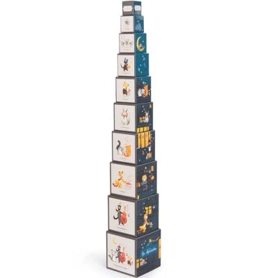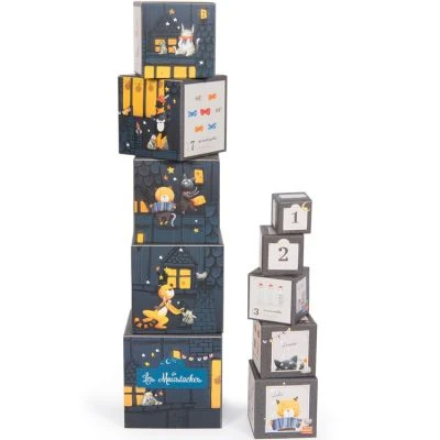 Les cubes empilables Les Moustaches 10 cubes de la marque Moulin Roty développent la capacité de l’enfant à manipuler et à compter.