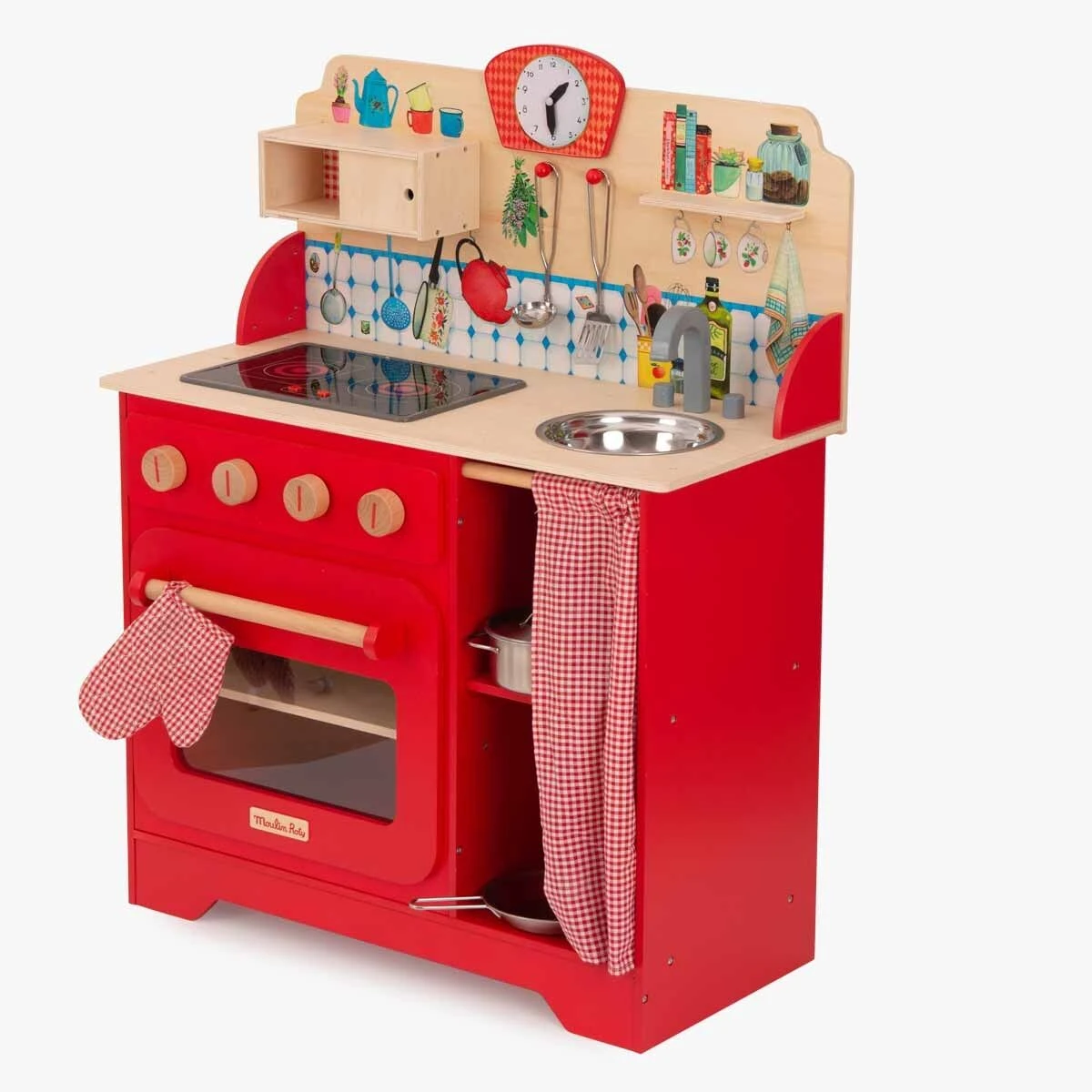 Chouette, une journée aux fourneaux avec la Grande Famille ! Cette cuisinière illustrée en bois comprend tous les accessoires pour préparer de bons petits plats : des ustensiles en métal, une manique vichy, et une plaque de cuisson sonore et lumineuse.