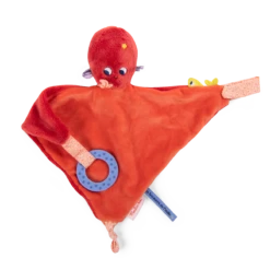 Doudou Paulie le petit poulpe, 3 en 1 avec attache-tétine et anneau de dentition pour soulager la poussée dentaire. Un compagnon bi-matières réconfortant décoré de petites étiquettes très appréciées des bébés et de détails brodés.