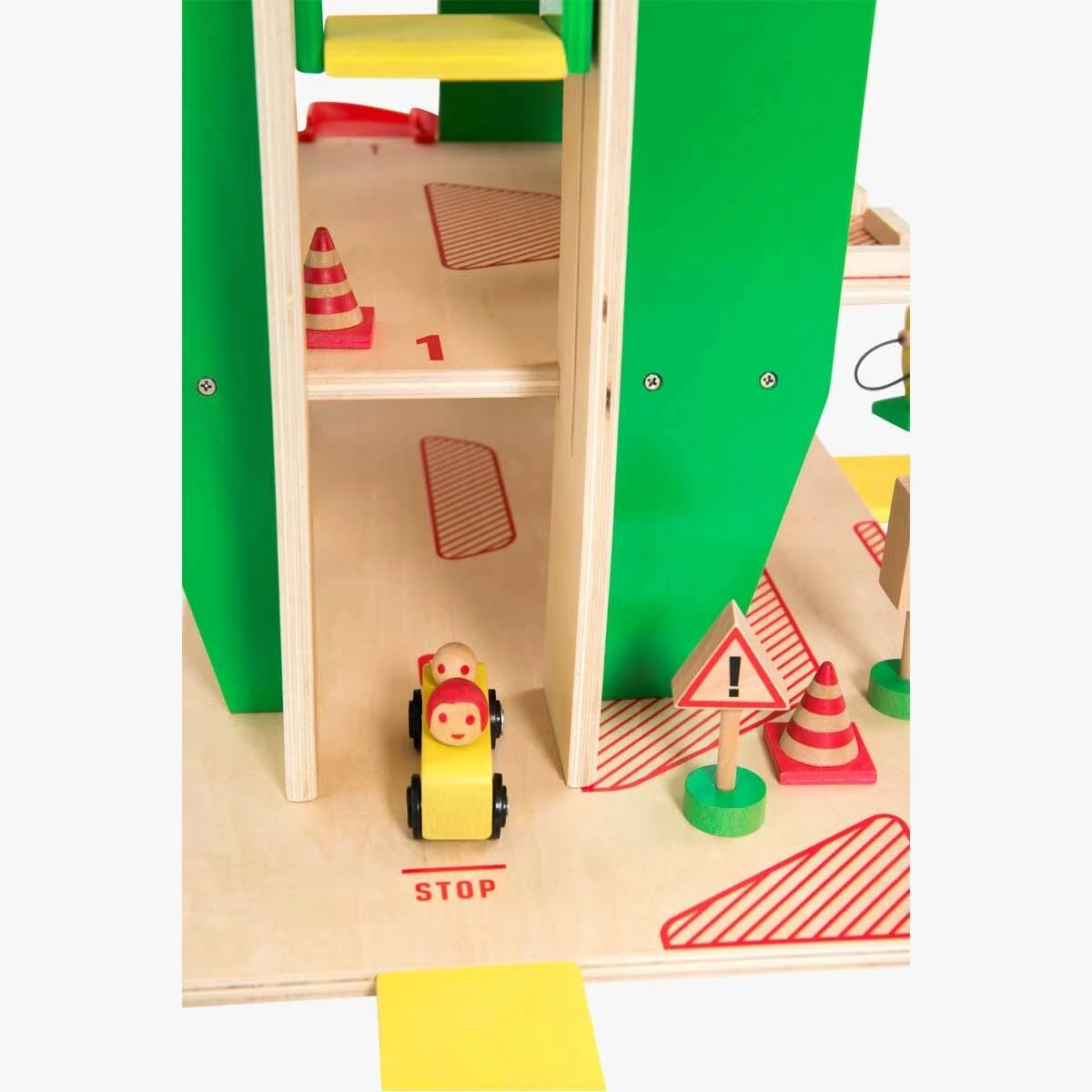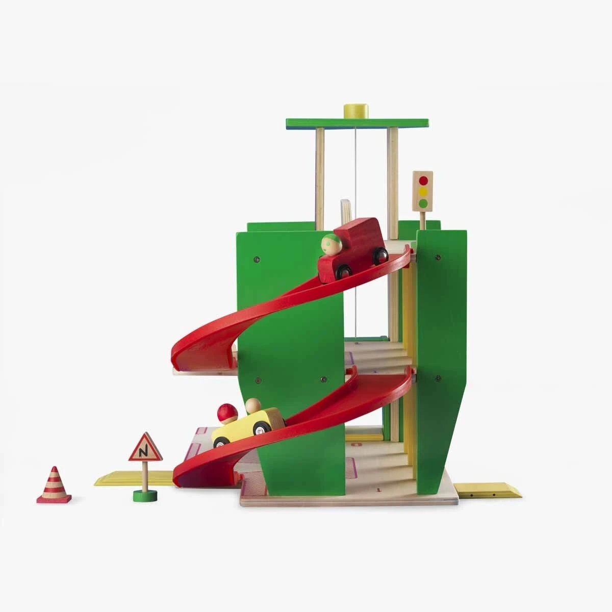 Pureté des lignes, jeu graphique entre bois et couleurs primaires pour ce grand garage, création d’Aurélien Débat. L’enfant peut faire circuler ses véhicules, les remplir de carburant, ou à l’aide de la molette, élever le monte charge.