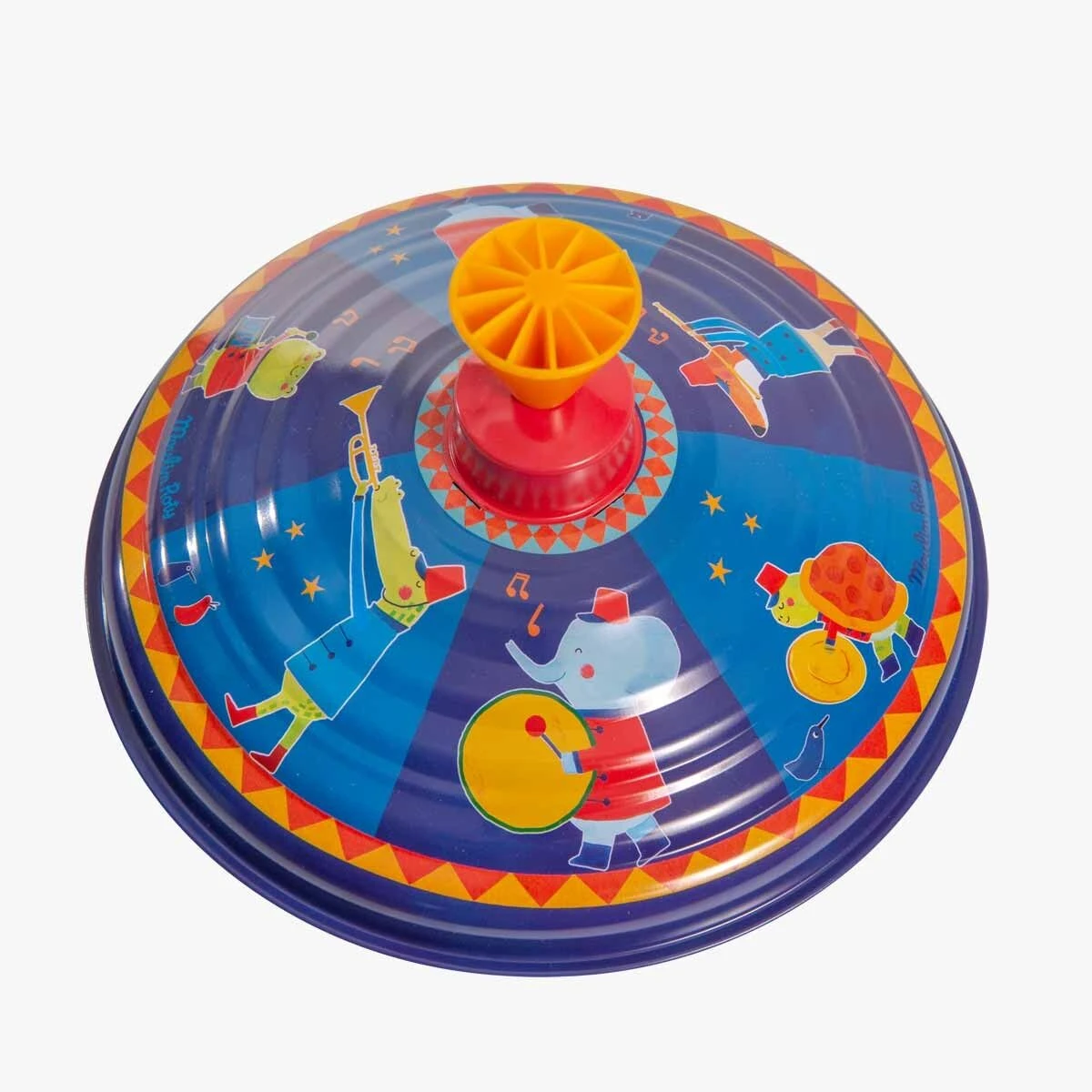 Grande toupie en mĂ©tal, illustrĂ©e d’une fanfare d’animaux joyeux et colorĂ©s ! Les voilĂ qui avancent en cadence, au rythme de la toupie tournante et sifflotant ! Un classique des jeux qui amusent autant les petits que les grands.