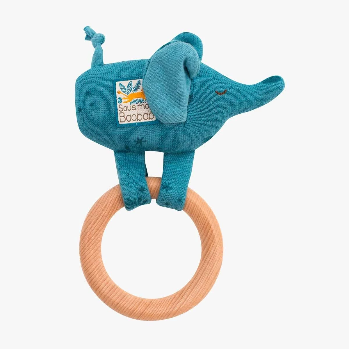 Anneau en bois où s’agrippe l’éléphant en molleton imprimé bleu. Il fait du bruit quand on l’agite grâce au hochet qui se cache à l’intérieur. Jeu de matières qui éveille l’intérêt de bébé et développent sa capacité à saisir un objet.