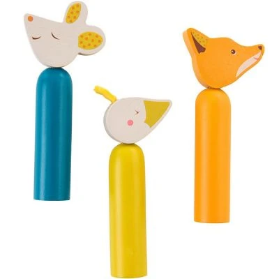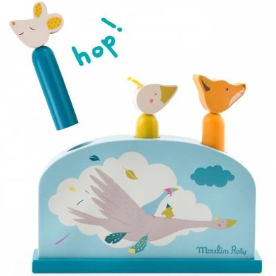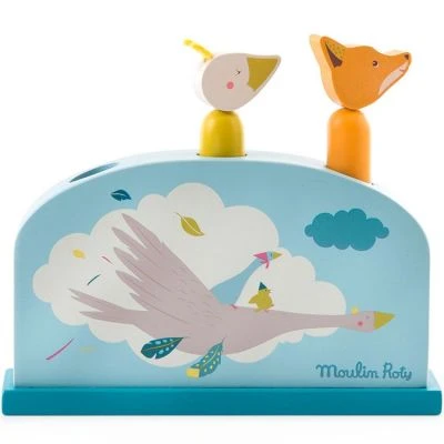 Le jeu à encastrer Le voyage d’Olga de la marque Moulin Roty est en bois peint avec trois personnages du voyage d’Olga : l’oie, la souris et le renard, prêts à sauter partout ! Le jeu d’éveil consiste à appuyer sur la tête pour voir le personnage sauter.
