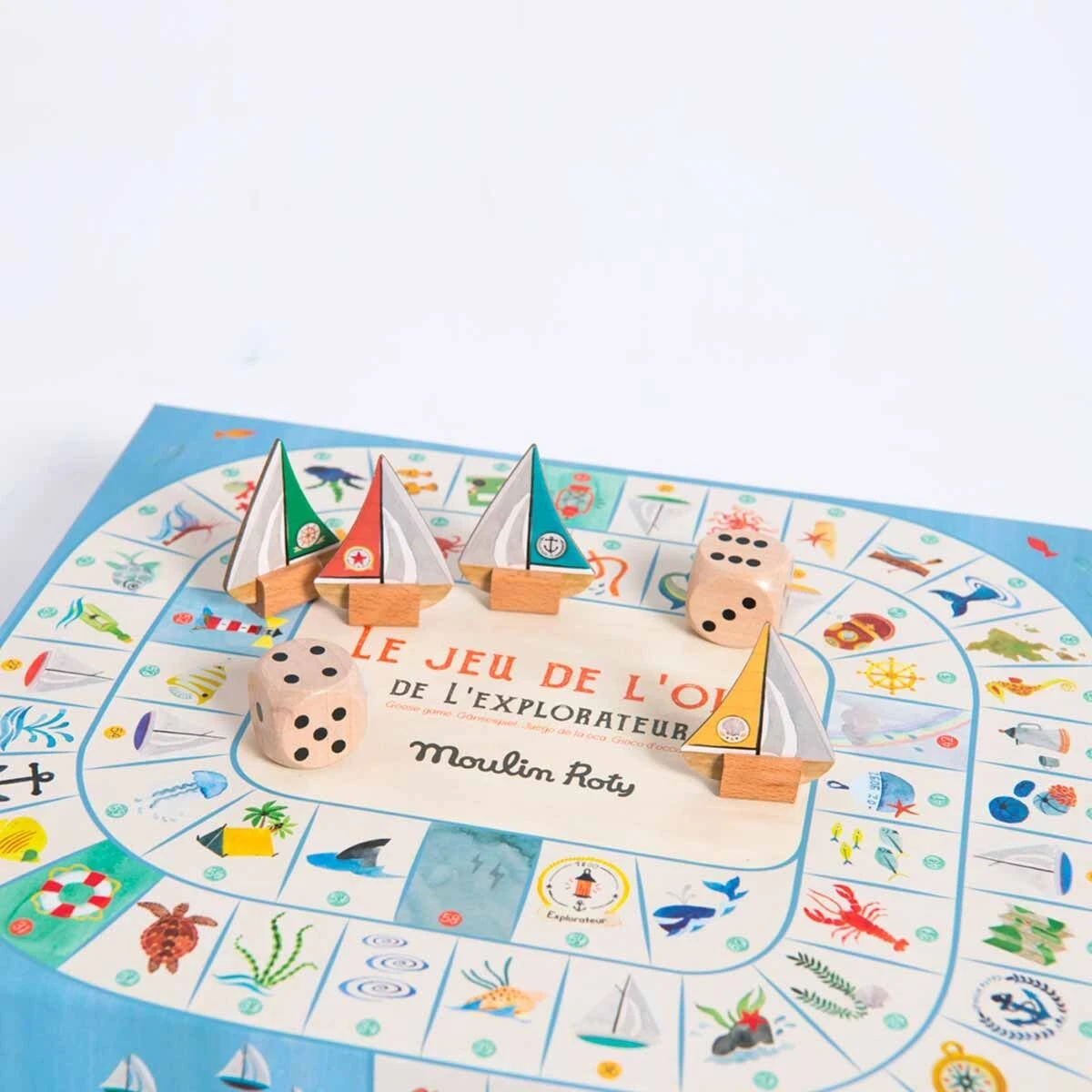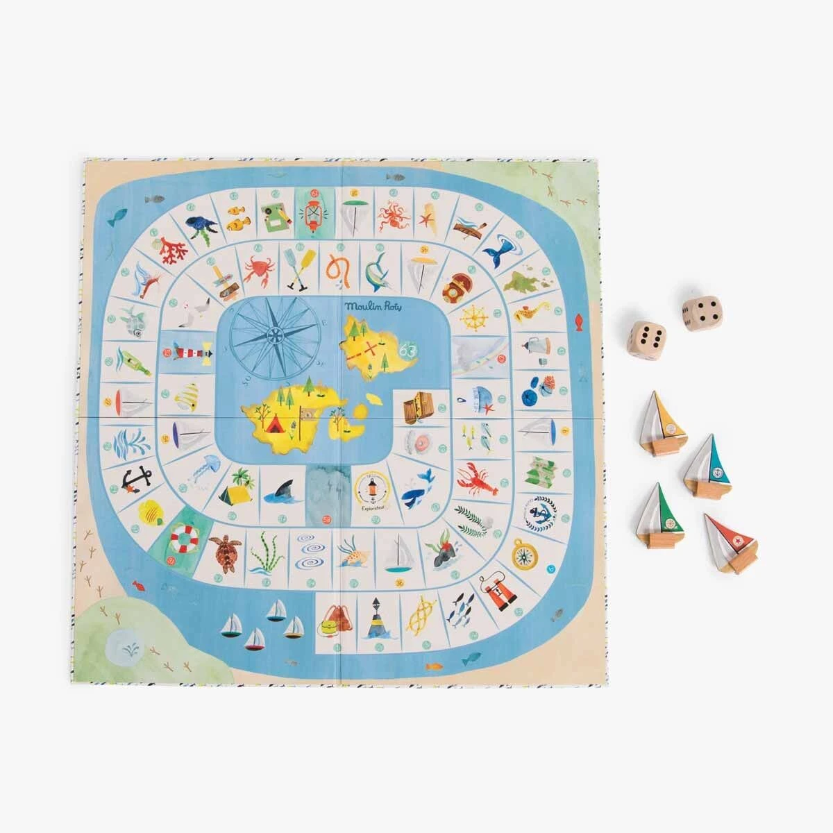 Un jeu de l’oie spĂ©cial explorateur oĂą l’on croise de drĂ´les de poissons et de dangereux tourbillons… Hissez les voiles, le premier arrivĂ© sur l’Ă®le gagne le trĂ©sor ! Comprend 4 pions bateaux, 2 grands dĂ©s et un plateau illustrĂ© Ă l’aquarelle.