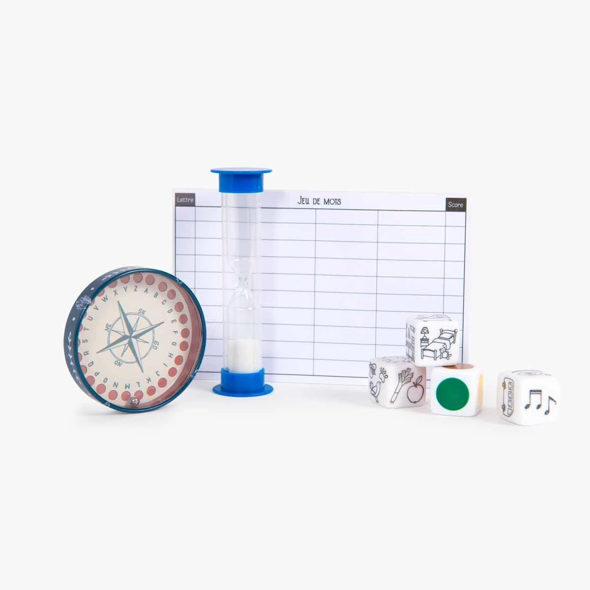 Pour s’amuser pendant la veillée au coin du feu : 4 dés à thème, 1 boîte alphabet et des carnets de notes pour trouver des mots correspondants au thème et à la lettre choisie, dans la limite du sablier ! À jouer en mode compétition ou collaboration.