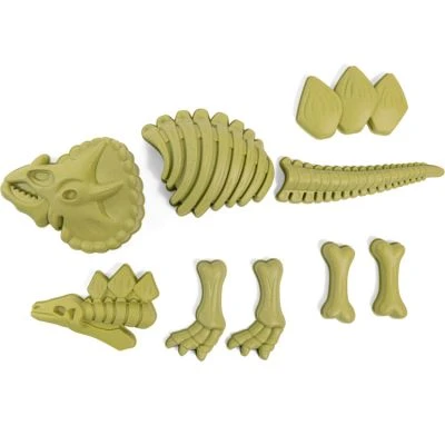 – 9 moules à sable riches en détails pour reproduire un squelette de dinosaure.