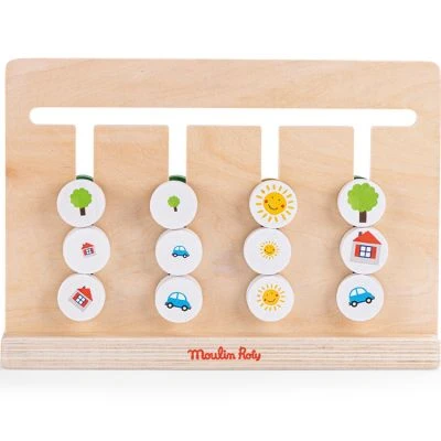 – But du jeu : observe bien la carte piochée et reproduis les séquences en faisant glisser les boutons de bois sur la face choisie (couleurs ou images) le plus rapidement possible.