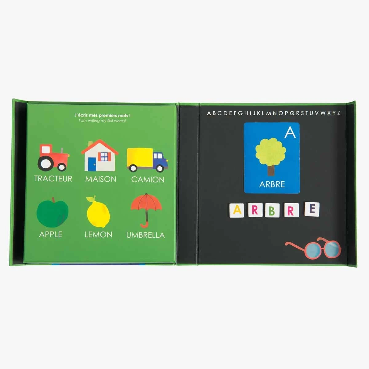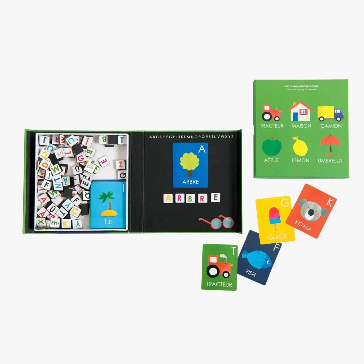Jeu magnétique en carton pour découvrir l’alphabet et reproduire ses premiers mots ! Sur la plaque aimantée, formez les mots à l’aide de 168 magnets lettres, en suivant les 26 cartes illustrées aux couleurs des Popipop, en français/anglais !