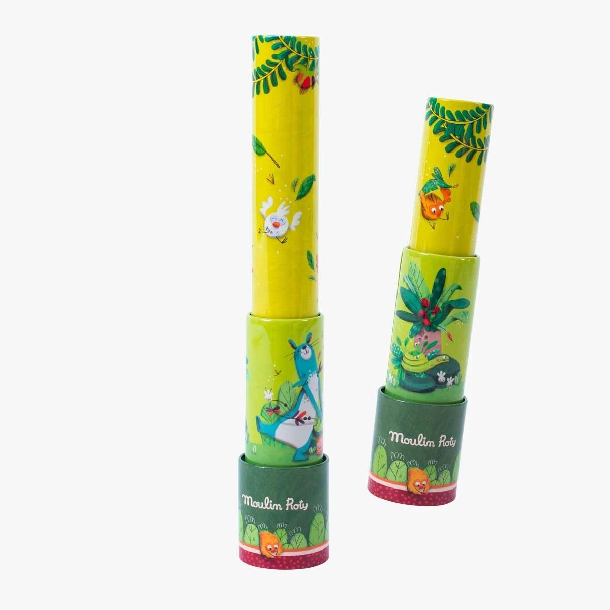 Kaléidoscope en métal coloré, illustré de l’univers Dans la jungle. Tourner, en même temps et à contre sens, les deux parties du Kaléidoscope pour découvrir toujours plus de nouvelles combinaisons de couleurs.