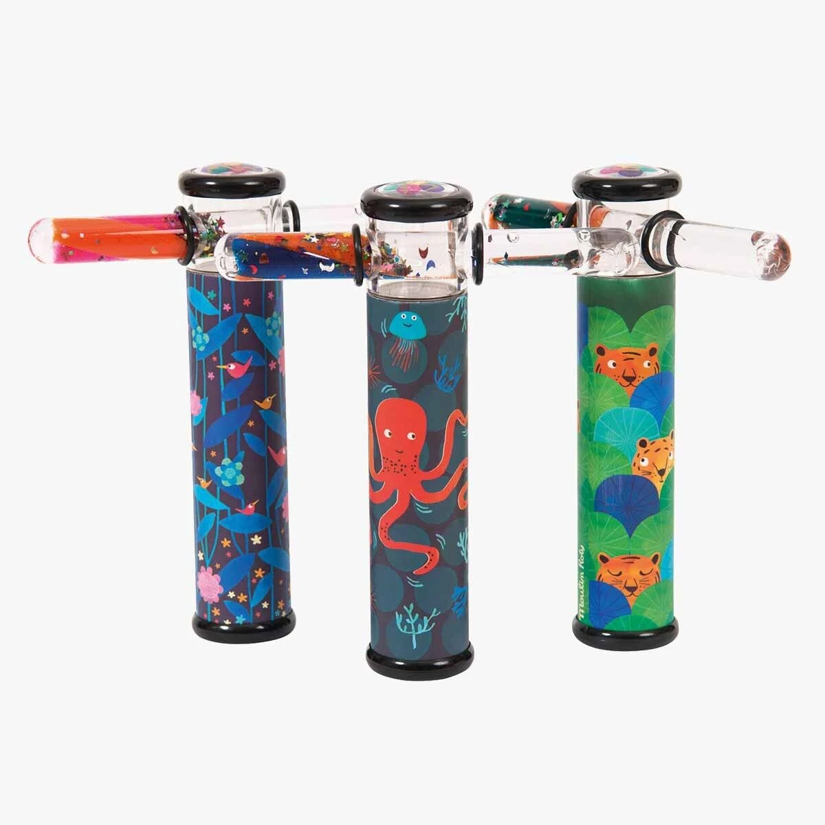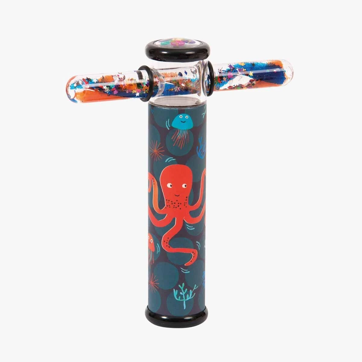 Kaléidoscope aux illustrations naïves et colorées pieuvres et coraux avec à son extrémité un tube coulissant contenant du gel et des paillettes qui, associé aux petits miroirs du kaléidoscope, démultiplie à l’infini les combinaisons de formes et de couleurs.