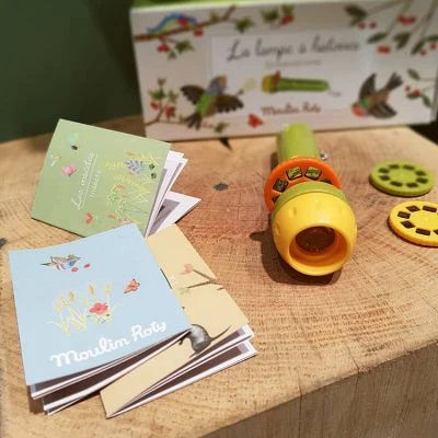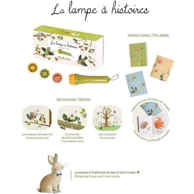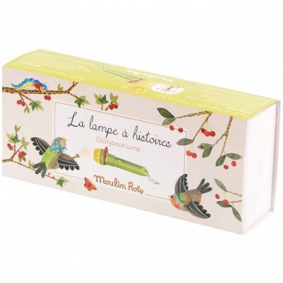 La lampe à histoires Le Jardin du Moulin de la marque Moulin Roty développe l’imagination des enfants et encourage leur créativité. La lampe à histoire projette au mur grâce à ses trois disques trois histoires différentes. Laissez-vous emporter dans l’univers des petits animaux du Jardin du Moulin.