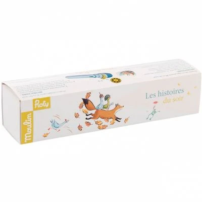 La lampe à histoires Le voyage d’Olga de la marque Moulin Roty développe l’imagination des enfants et encourage leur créativité. La lampe à histoire projette au mur grâce à ses trois disques, trois histoires différentes. Laissez-vous emporter dans l’univers d’Olga et ses amis à travers les illustrations poétiques aux couleurs tendres.