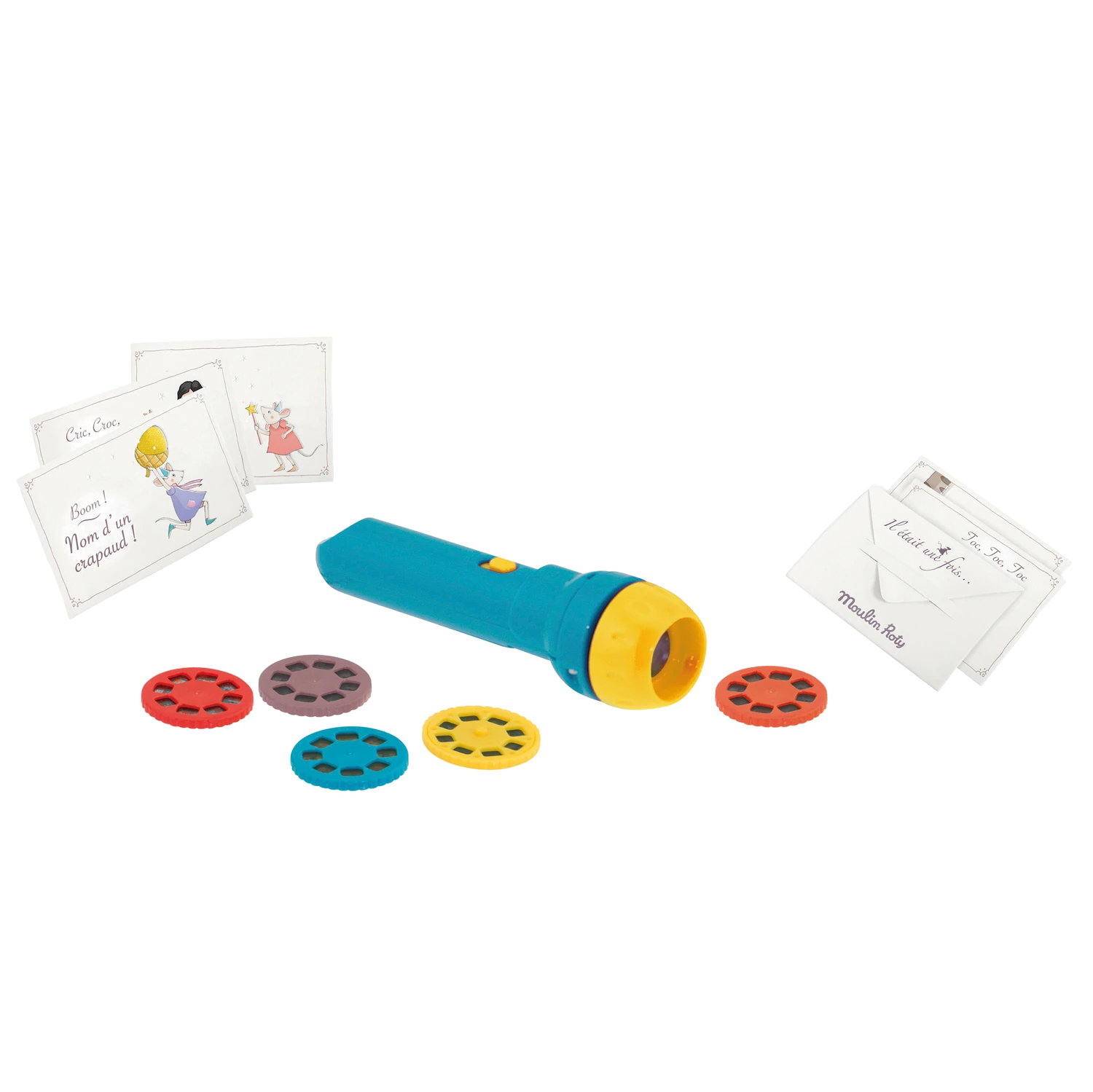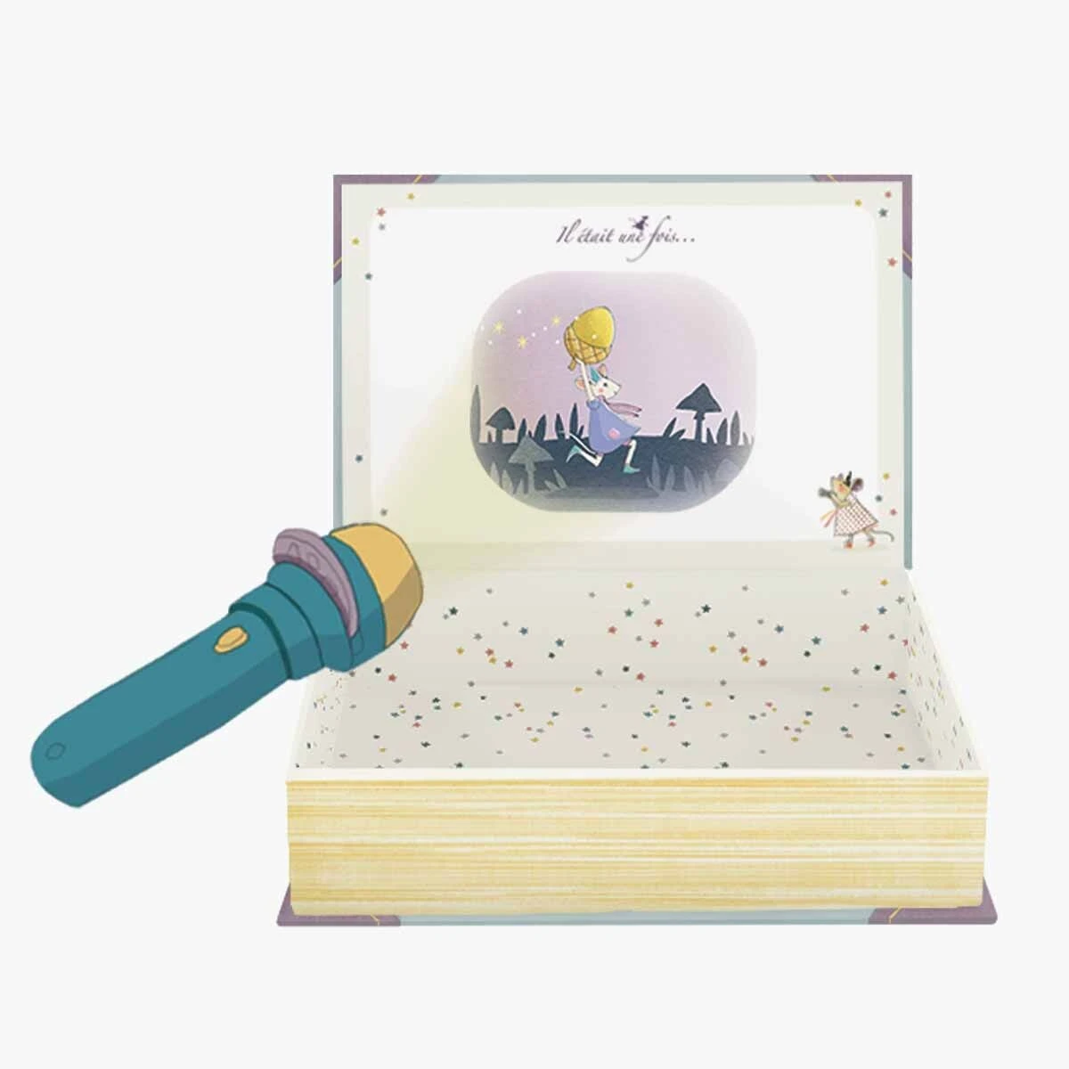 Ravissant coffret aimanté, joliment illustré, conçu comme un livre et contenant : une lampe à projeter avec 5 histoires de contes et de précieux cartons d’invitation aux spectacles, en forme de mini enveloppes avec des messages secrets.