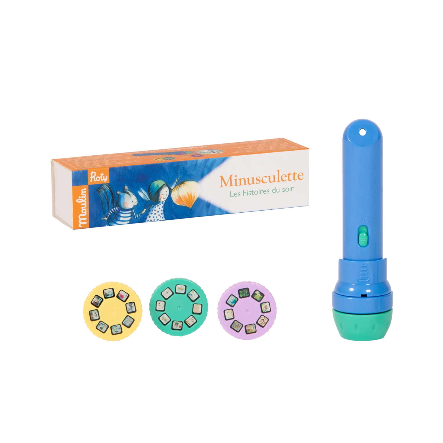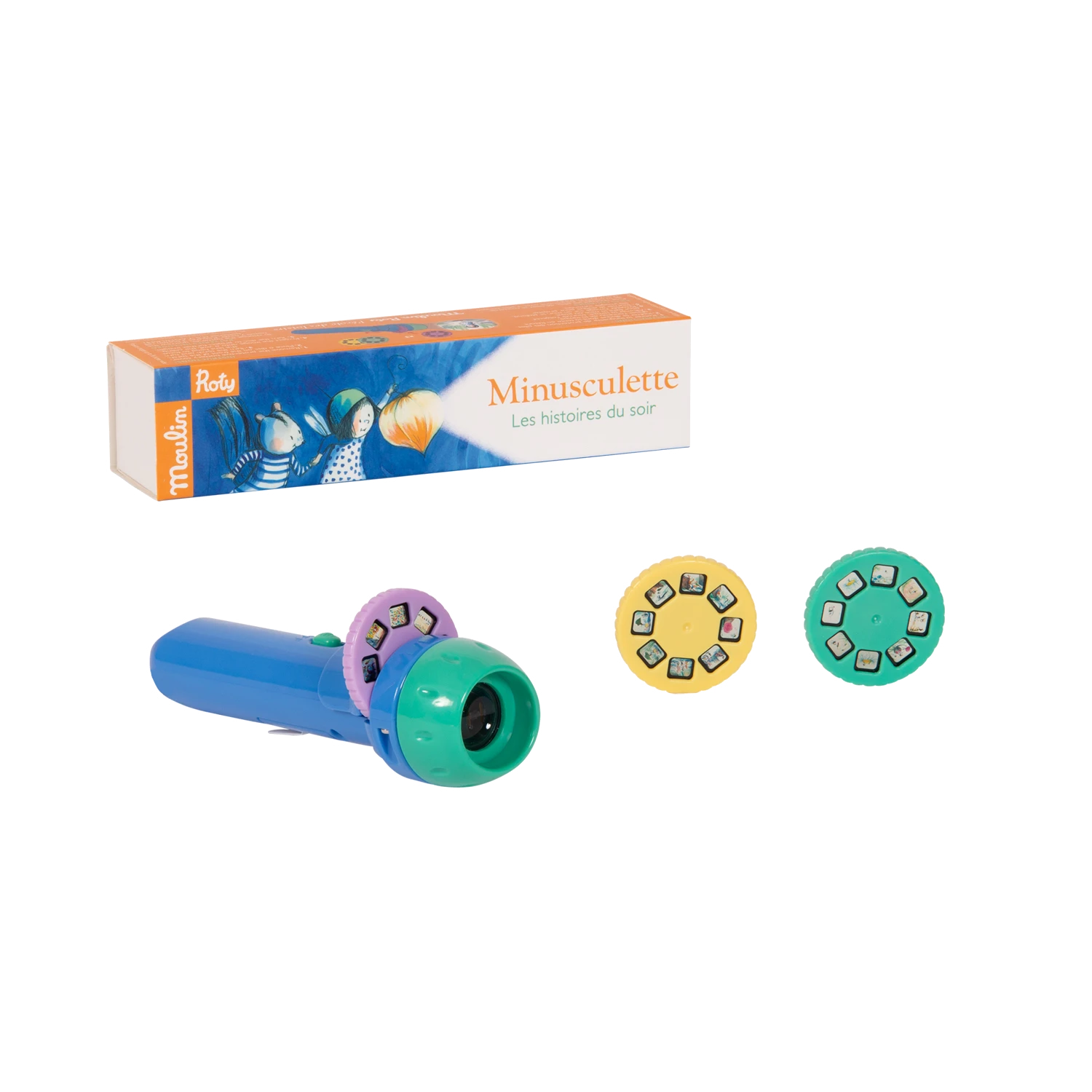Lampe torche de poche où chacun des 3 disques projetés sur le mur raconte les aventures de Minusculette, une petite héroïne féérique de l’école des loisirs. Pour endormir les tout-petits et développer leur imagination !
