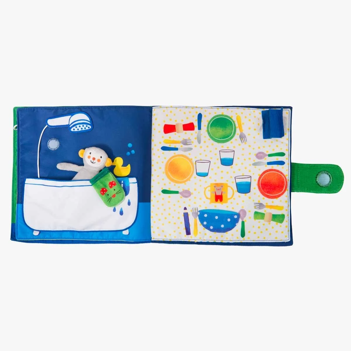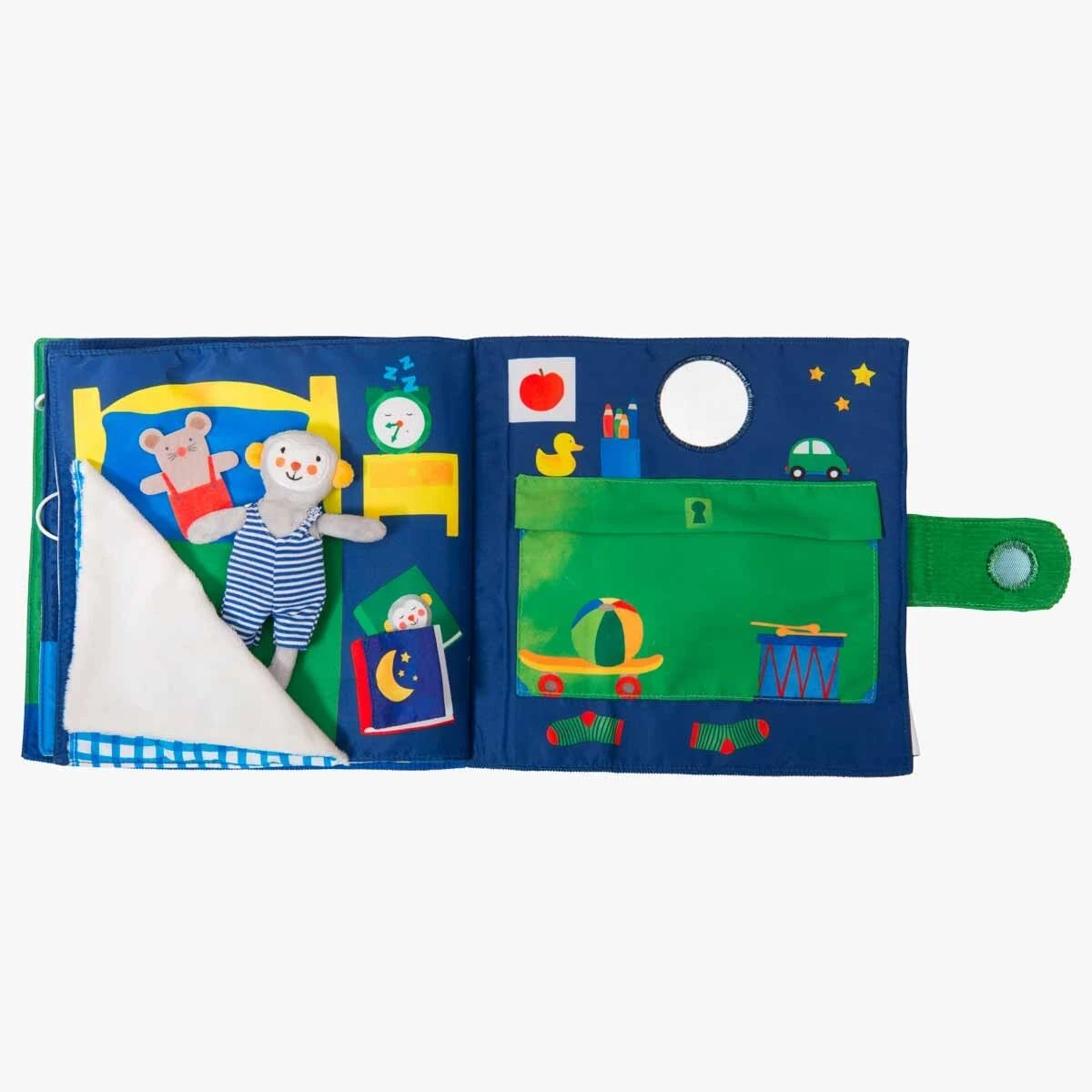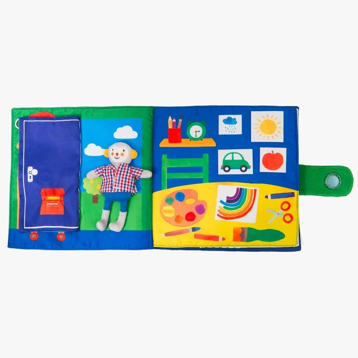 Livre d’activités en tissu de 4 pages, avec poupée Singe des Popipop à accompagner jusqu’au dodo ! Du dessin, un bon bain, le repas et une douce histoire… plein d’éléments à scratcher et replacer pour développer la motricité fine et l’imagination !