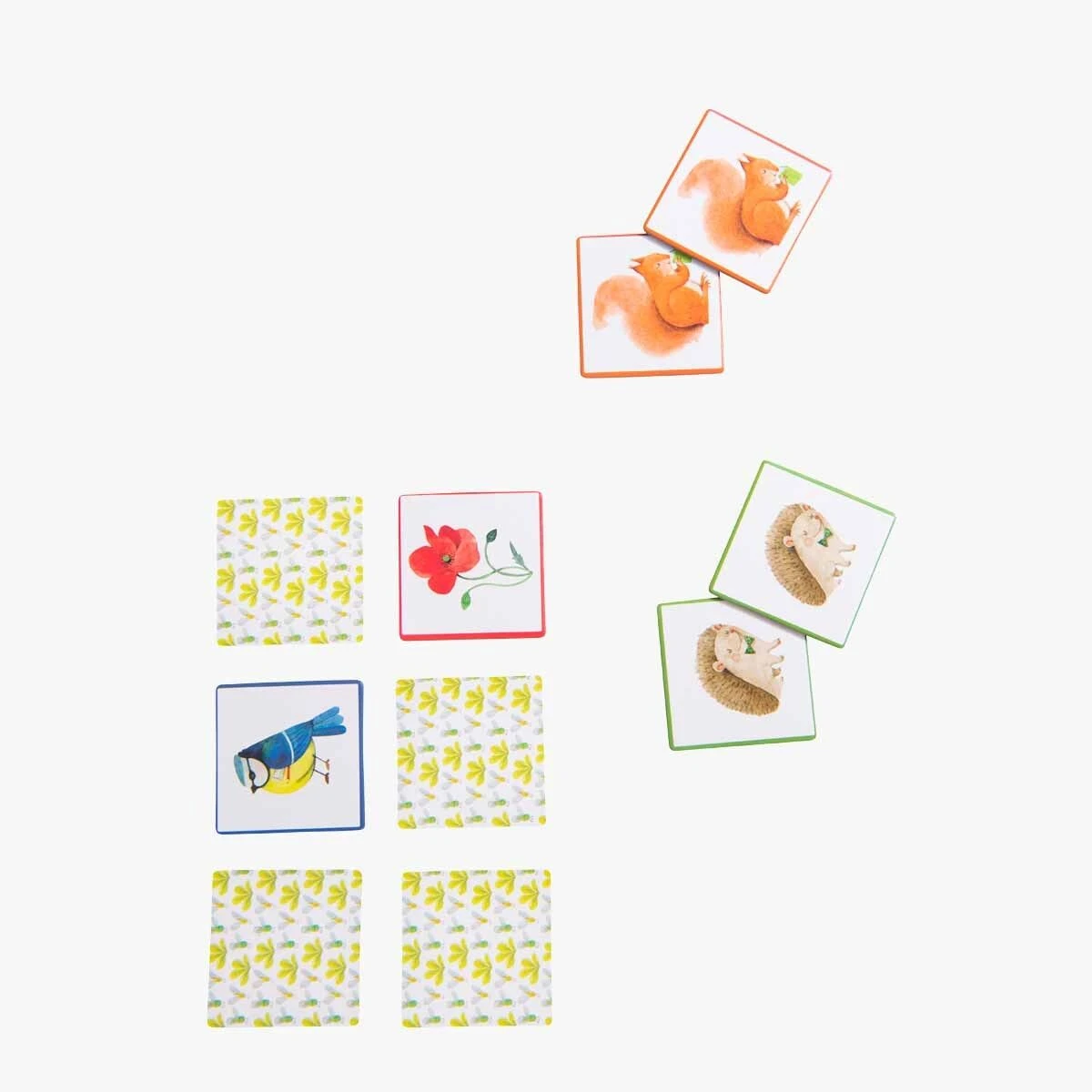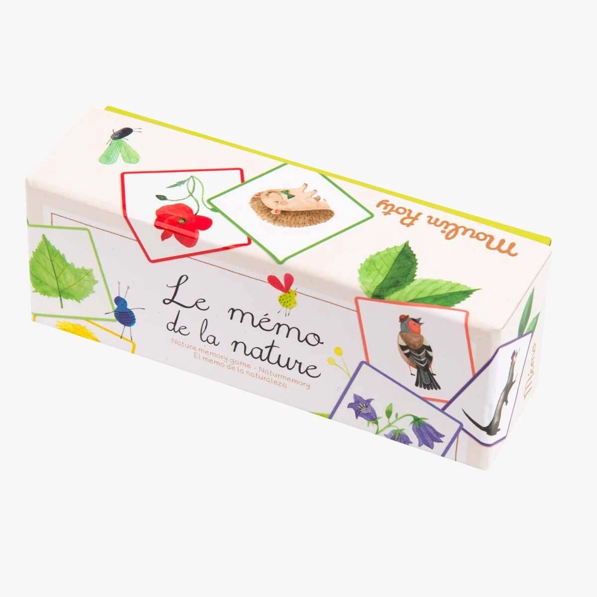 Le mémo de la nature comportant un jeu de 36 paires de cartes illustrées des éléments du jardin : feuille, châtaigne, coccinelle, coquelicot…