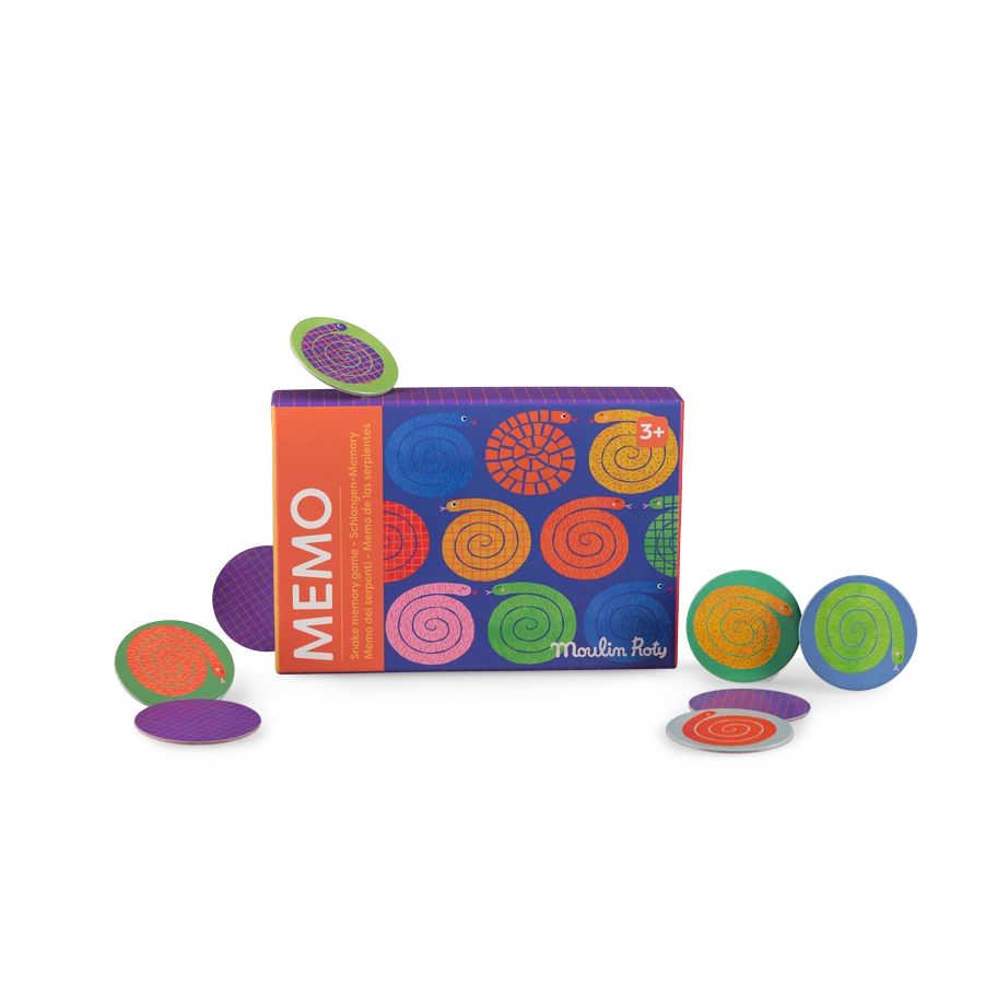 Jeu d’observation et mémoire des motifs et couleurs sur le thème des serpents ! Toutes les cartes rondes joliment illustrées, sont faces cachées sur la table, celui qui collecte le plus de paires de serpents est le gagnant. Contient 28 cartes. Dès 3 ans.