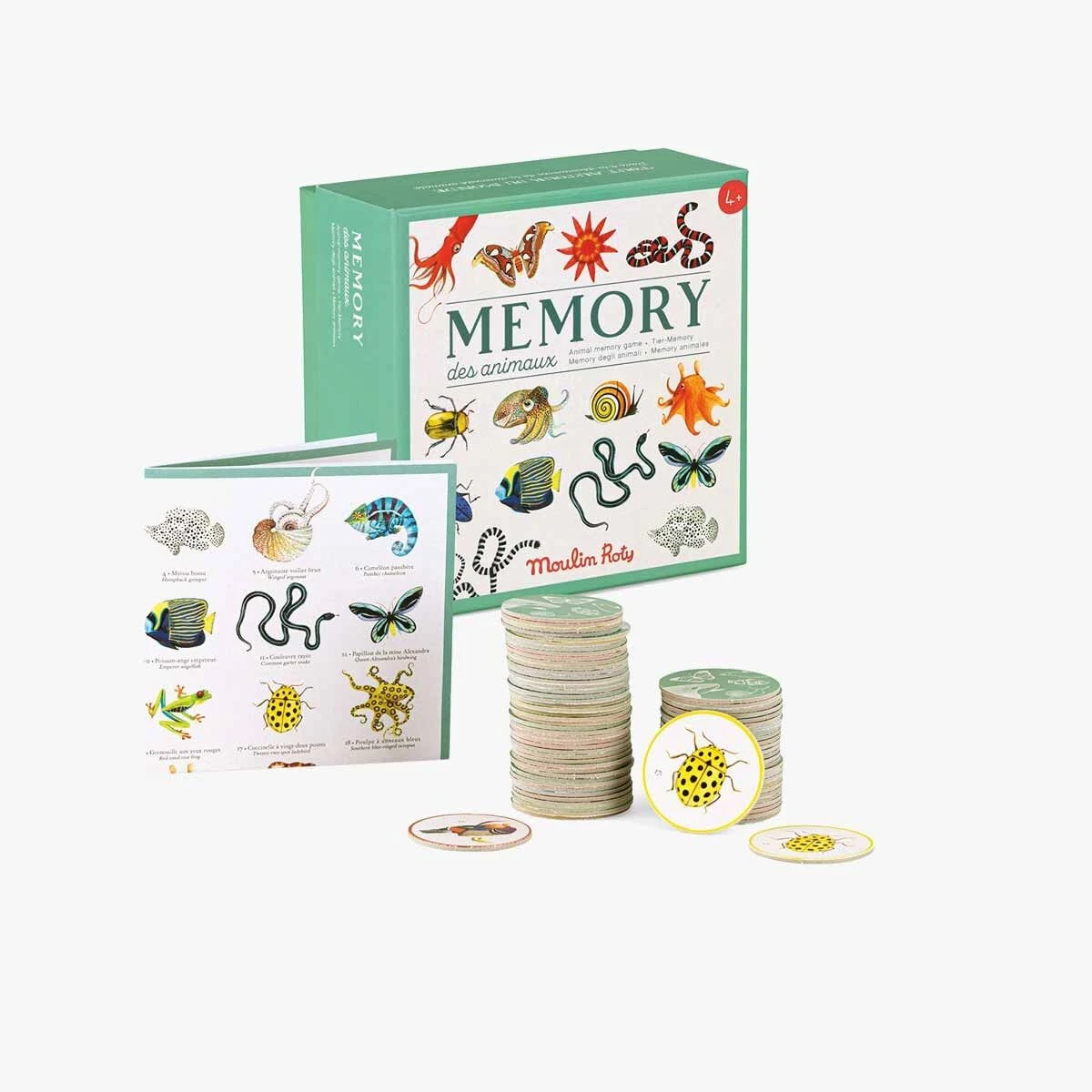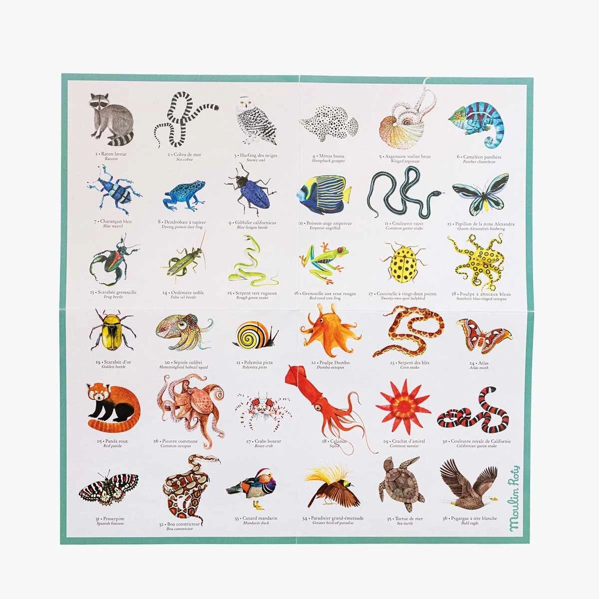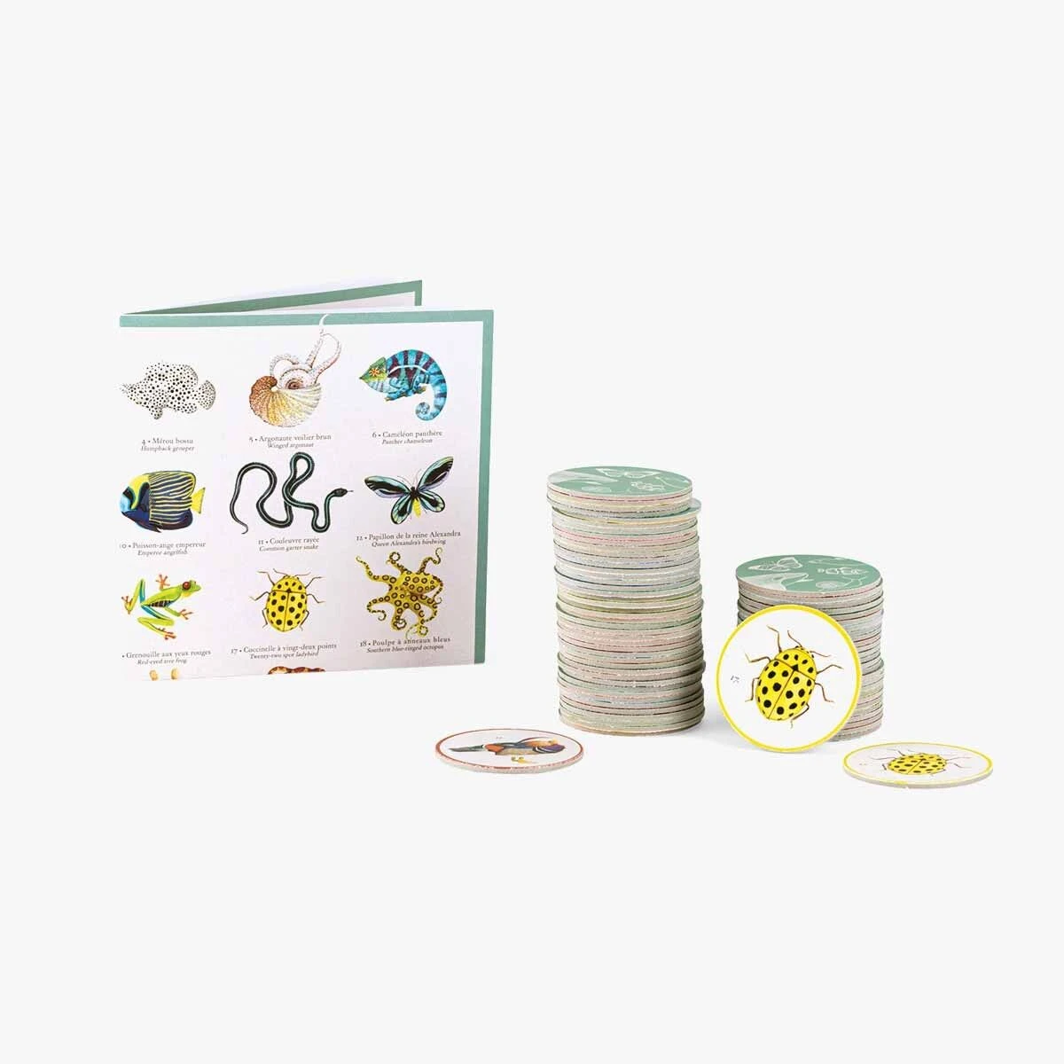 Jeu d’observation et de mémoire qui aborde le thème des animaux ! Toutes les cartes sont faces cachées sur la table, celui qui collecte le plus de paires d’animaux est le gagnant. Contient 36 cartes animaux x 2 et 1 poster.