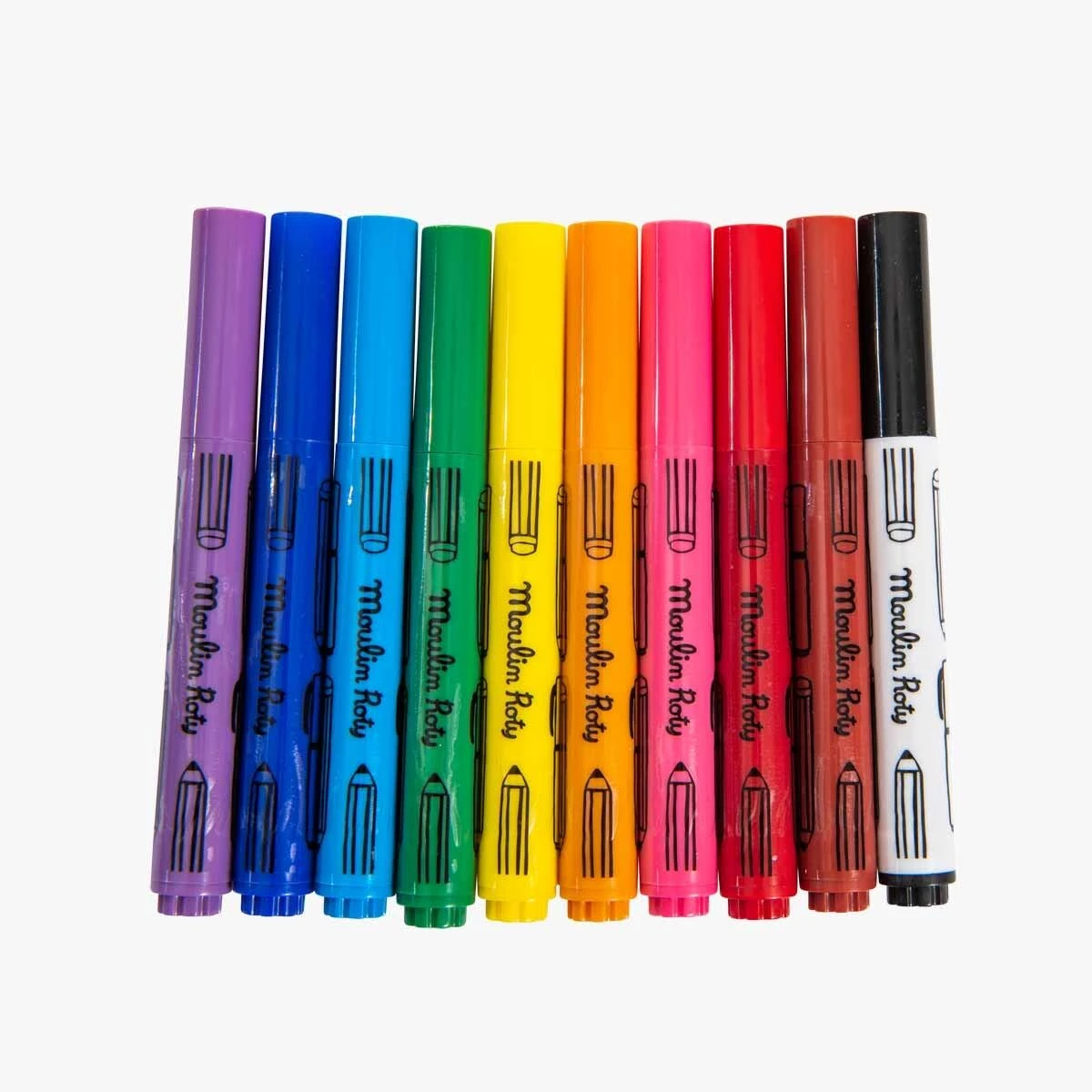 Dix gros feutres de couleur, avec une pointe arrondie qui ne s’enfonce pas ! Lavables, ils seront vite adoptĂ©s par les petits pour rĂ©aliser leurs premiers dessins.