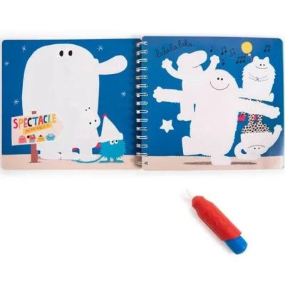 – Grâce à un pinceau magique avec réservoir d’eau, peindre les zones blanches sur chaque page pour faire apparaître comme par magie les illustrations.