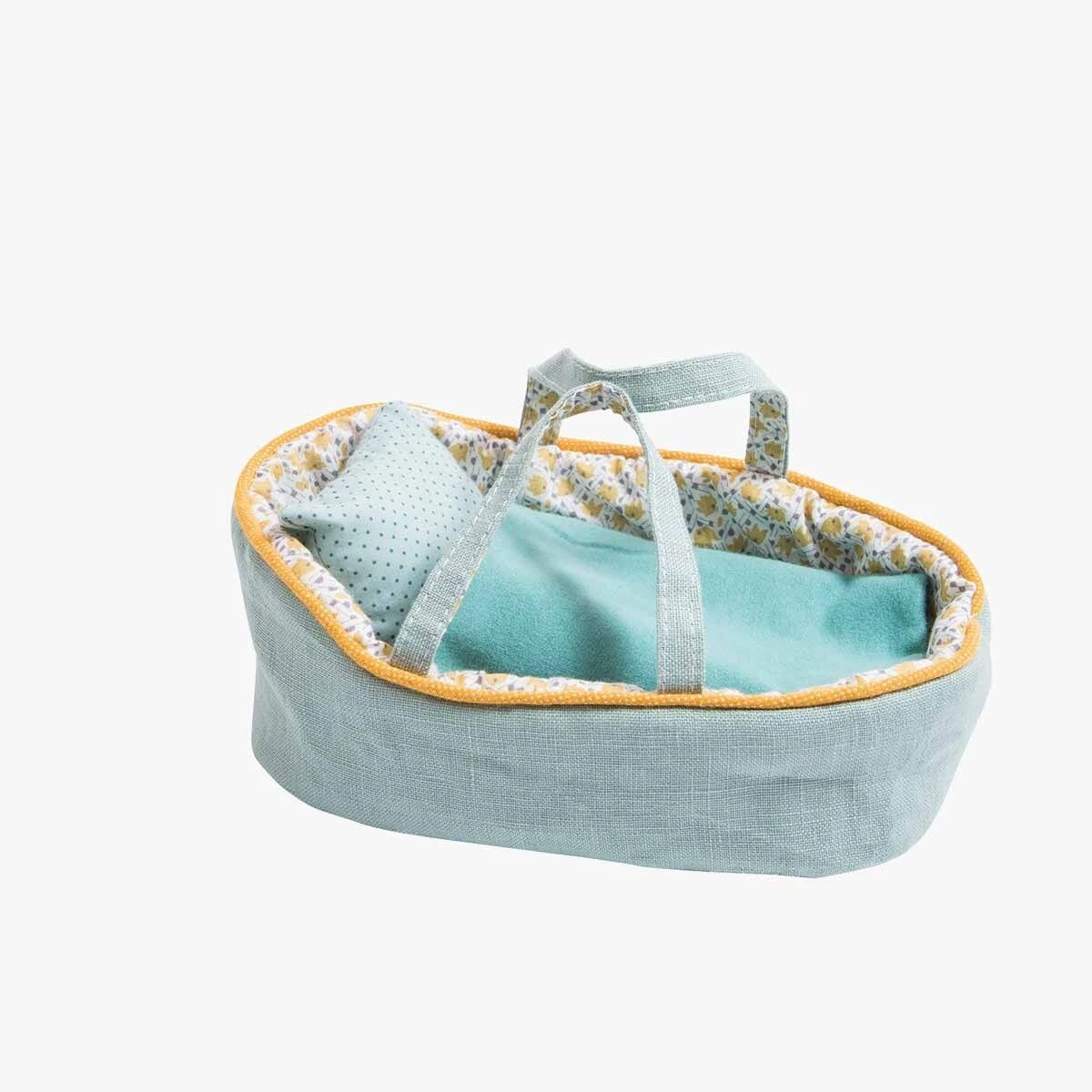 Pour endormir et promener sa poupée, petit couffin tout textile, composé d’un joli mélange de couleurs poudrées, en lin bleu grisé, doublé de coton imprimé fleuri jaune avec coussin et plaid assortis.