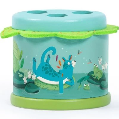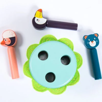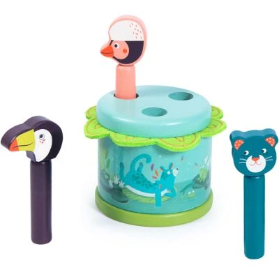 Le pop-up en bois Dans la Jungle de la marque Moulin Roty est colorĂ© et illustrĂ©. Sa structure cylindrique reprĂ©sente un marais et accueille nos trois personnages de la jungle : Pakou le toucan, Paloma l’oiseau et Koco le koala. Le jeu d’Ă©veil consiste Ă appuyer sur la tĂŞte pour voir le personnage sauter.