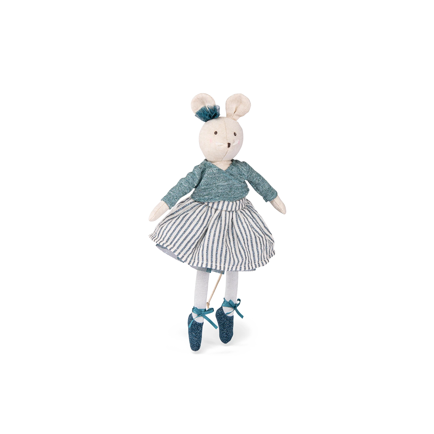 Petite souris Charlotte, en chambray au doux visage brodé et joues délicatement poudrées, tout de bleu vêtue, dispose de la panoplie complète de la danseuse. Amie idéale pour partager des instants féeriques, elle peut revêtir les tenues de la valise à tutus.