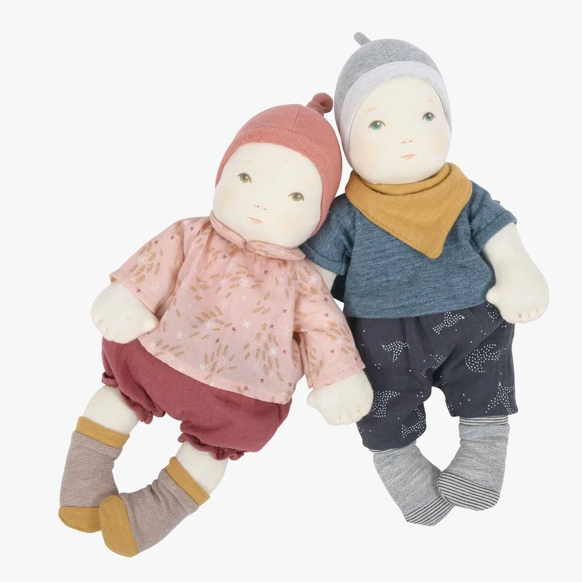 Bébé fille, ronde et douillette pour se glisser dans les mains des petits, au visage en coton illustré et imprimé. A pouponner pour de vrai, elle enfile chaque matin une blouse à motifs, un bloomer en lange, des socquettes et un bonnet assorti à sa tenue !