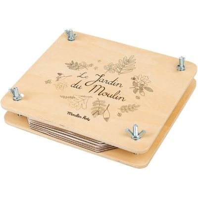 La presse à fleurs Le Jardin du Moulin de la marque Moulin Roty permet de faire sécher les fleurs, les feuilles que l’enfant aura cueillies. La presse est en bois, avec des illustrations comme un clin d’oeil aux veilles planches naturalistes.