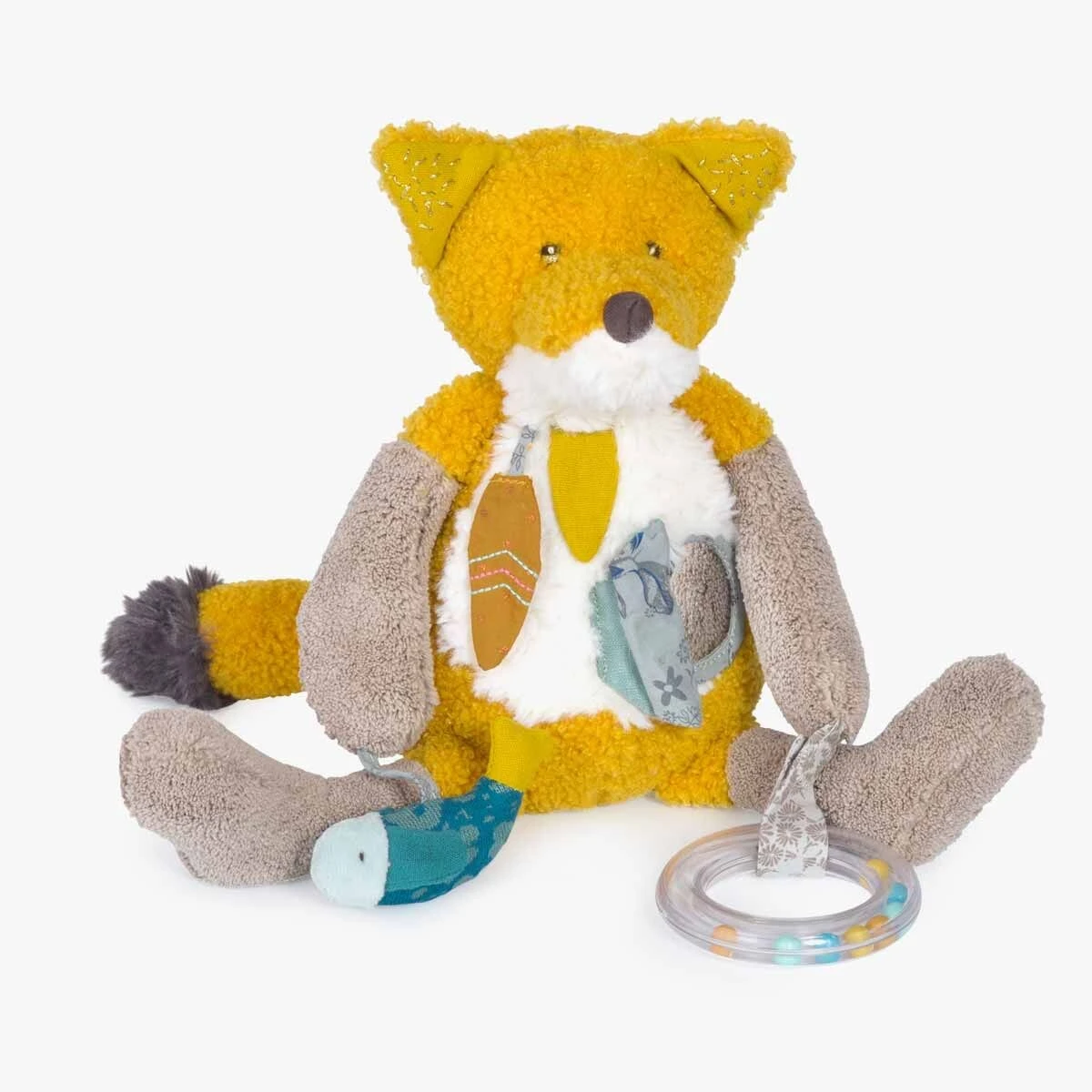Renard d’activités au doux pelage de fourrure bouclette moutarde et autres matières amusantes, chargé d’accessoires pour divertir bébé : pouet-pouet dans le bout de sa queue, hochet, miroir, plastique qui fait du bruit et anneau à billes.