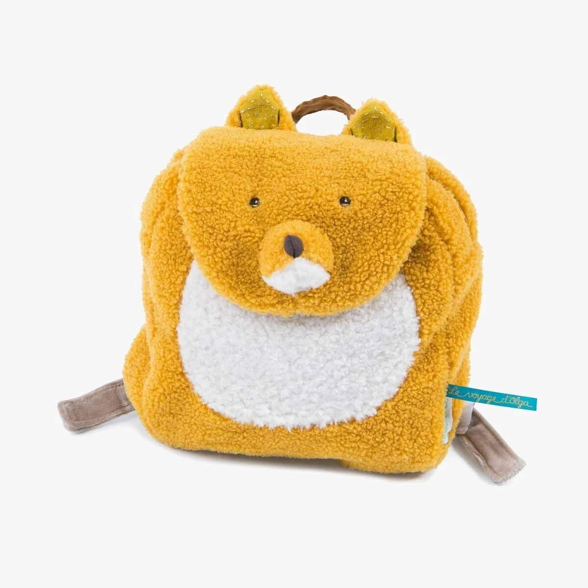 Sac à dos en forme de tête de renard, au doux pelage de fourrure bouclette ocre et blanc, pour transporter les affaires des tout petits. Peut contenir un cahier A5. Peut être brodé au prénom de l’enfant. Idéal pour un cadeau naissance.