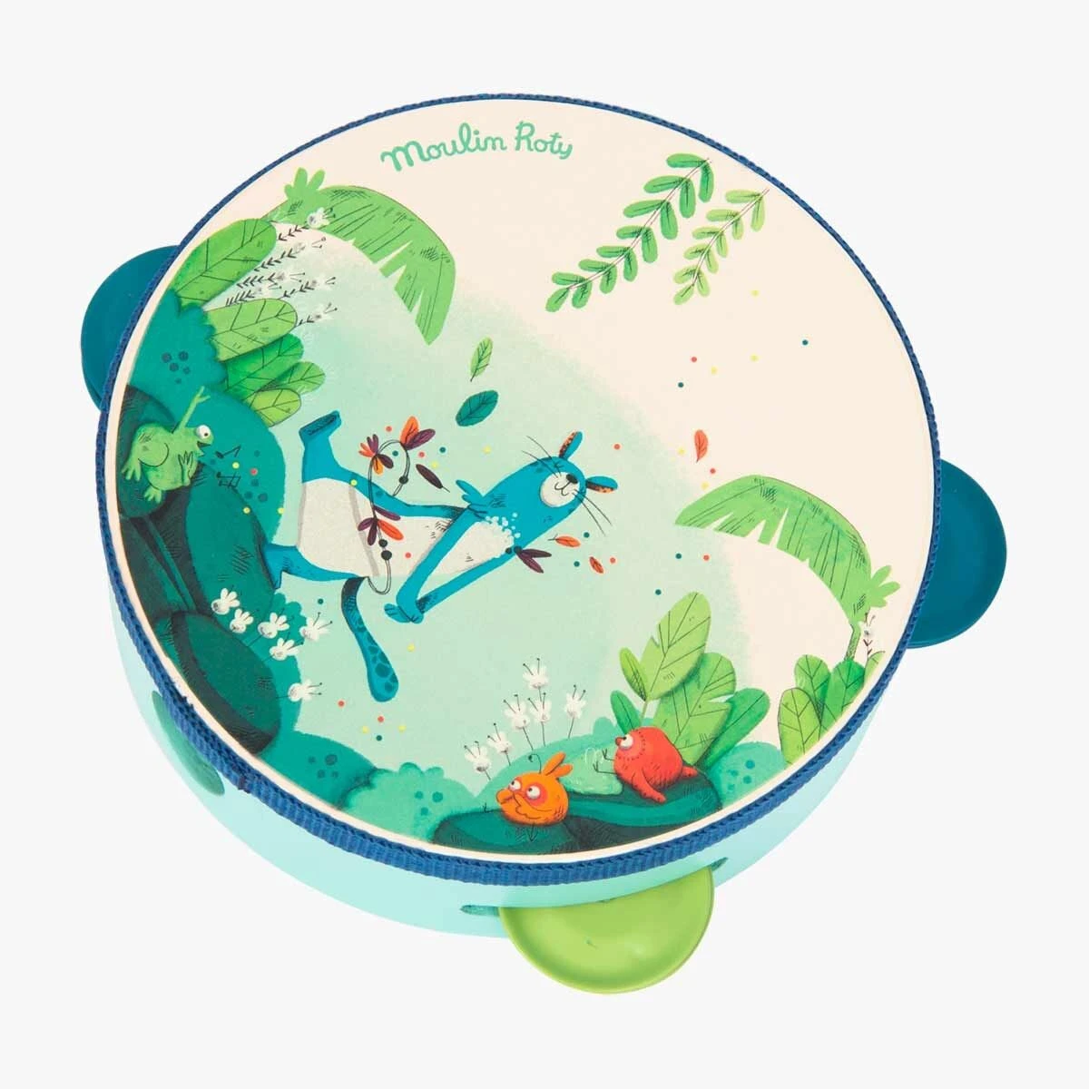 Tambourin en bois avec 4 cymbales, peint en vert d’eau avec ruban sur la tranche et illustrations de Zimba la panthère dansant au cĹ“ur de la jungle. DĂ©veloppe le rythme et l’Ă©veil musical des tout-petits, facile Ă utiliser.
