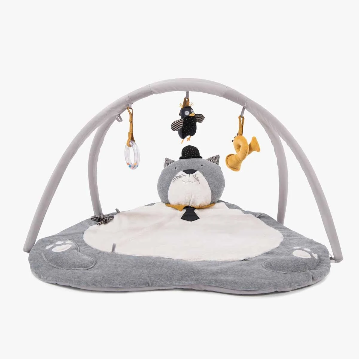 Tapis d’activités Fernand le chat, pour accueillir bébé en douceur sur un pelage tout doux, et éveiller ses sens grâce aux différentes matières et éléments suspendus : anneau bille, hibou hochet et une trompette qui fait pouët !