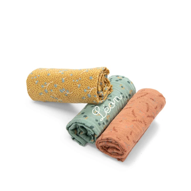 Le lot de 3 langes imprimés Moulin Roty Trois Petits Lapins se déclinent en trois beaux coloris sauge, argile et ocre. Petit plus : le lange sauge est personnalisable avec une broderie au prénom de l’enfant (en option)