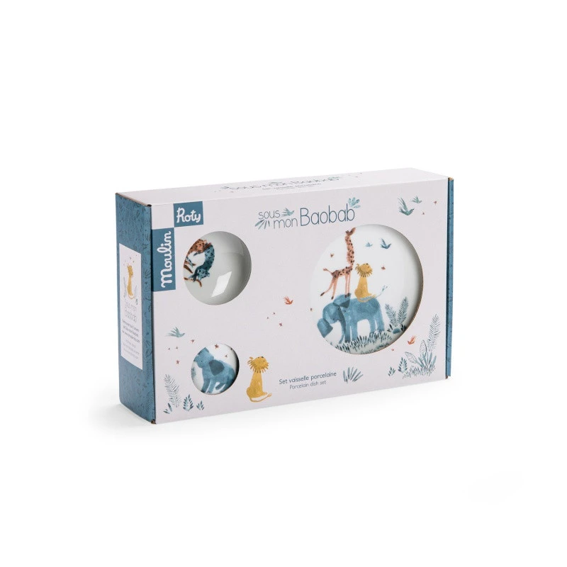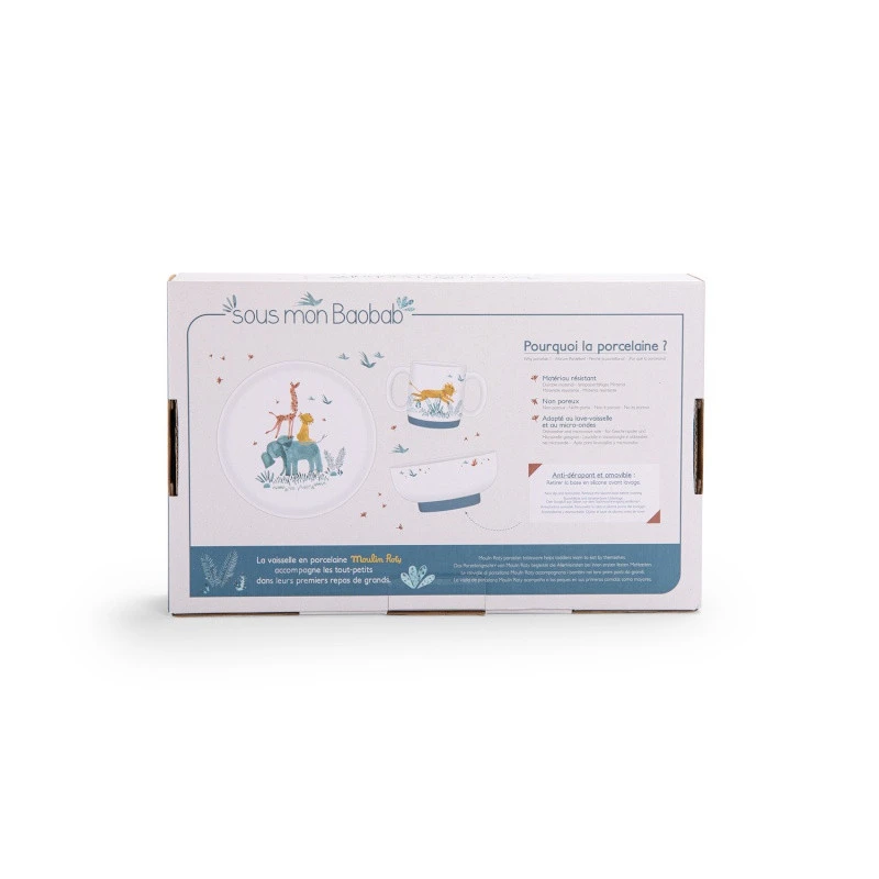 Le coffret repas en porcelaine Sous mon baboab par Moulin Roty convient aux enfants à partir de 3 ans et constitue une excellente idée de cadeau pour un anniversaire par exemple, ou sur votre liste de naissance… en prévision !